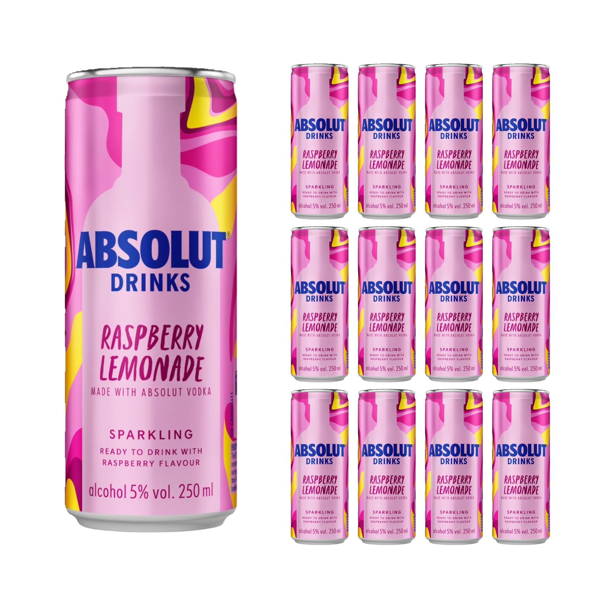 A pre-mixed, sparkling alcoholic beverage featuring Absolut Vodka blended with natural raspberry and lemon flavors.