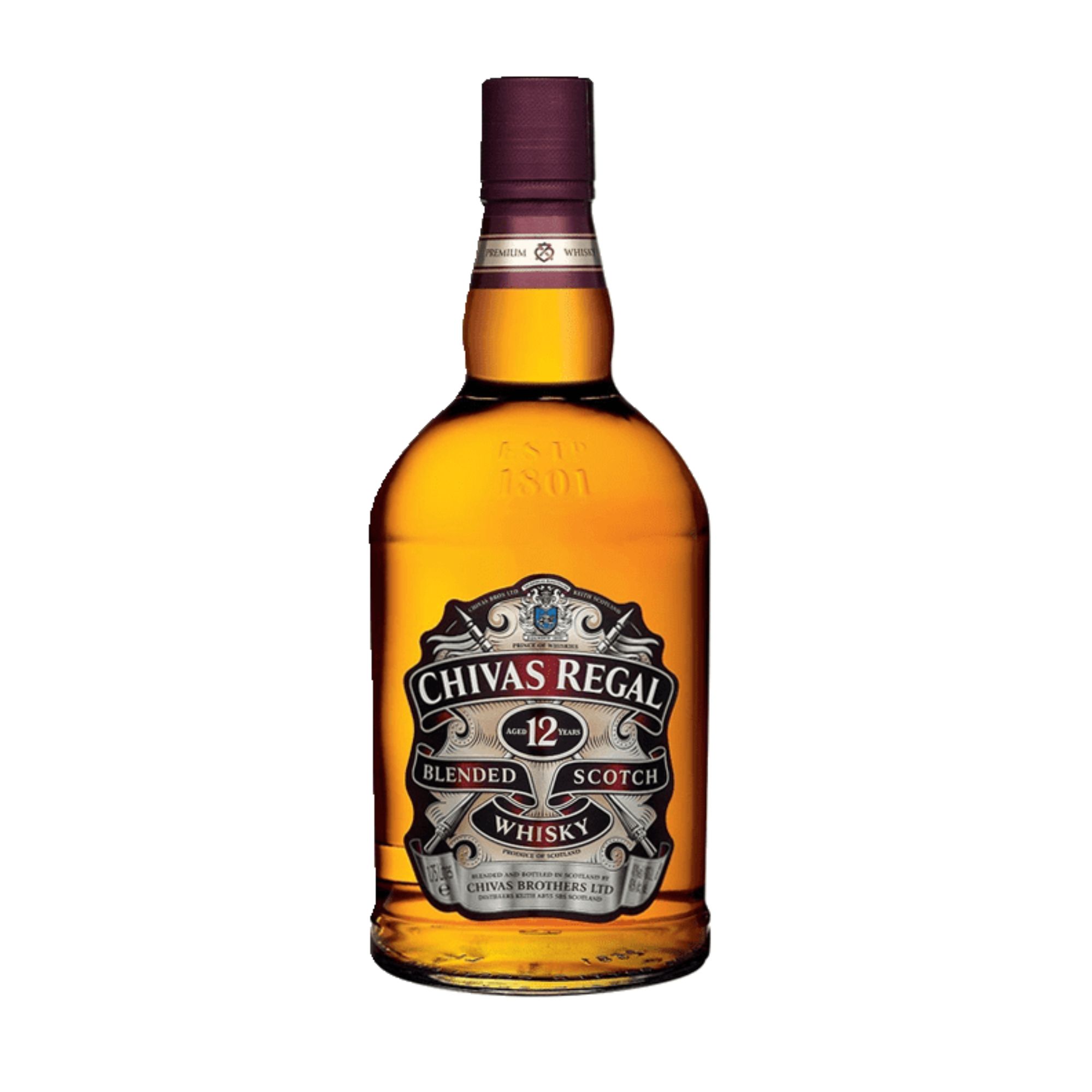Chivas Regal 12 is a premium blended Scotch whisky crafted from a selection of the finest malt and grain whiskies, each matured for at least 12 years. At its heart is the Strathisla single malt, contributing to its rich and smooth character. The whisky offers a harmonious blend of flavors, including notes of ripe orchard fruits, wild herbs, heather, and sweet honey. On the palate, it is round and creamy, featuring hints of vanilla, hazelnut, and butterscotch, culminating in a rich and lingering finish
