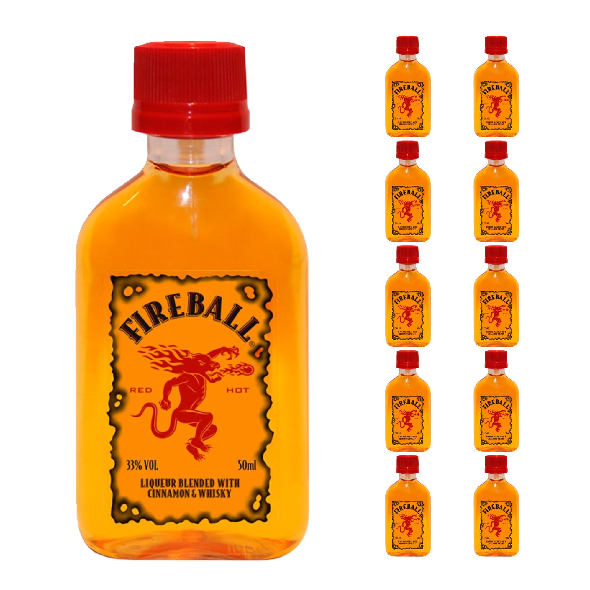 Fireball is a bold and fiery cinnamon-flavored whisky liqueur that’s both sweet and spicy. Crafted by blending smooth Canadian whisky with natural cinnamon flavoring, it delivers a warm, intense kick that’s perfect for shots or mixing into cocktails. This convenient 10-pack of 50ml bottles is ideal for parties, gifts, or enjoying on the go.