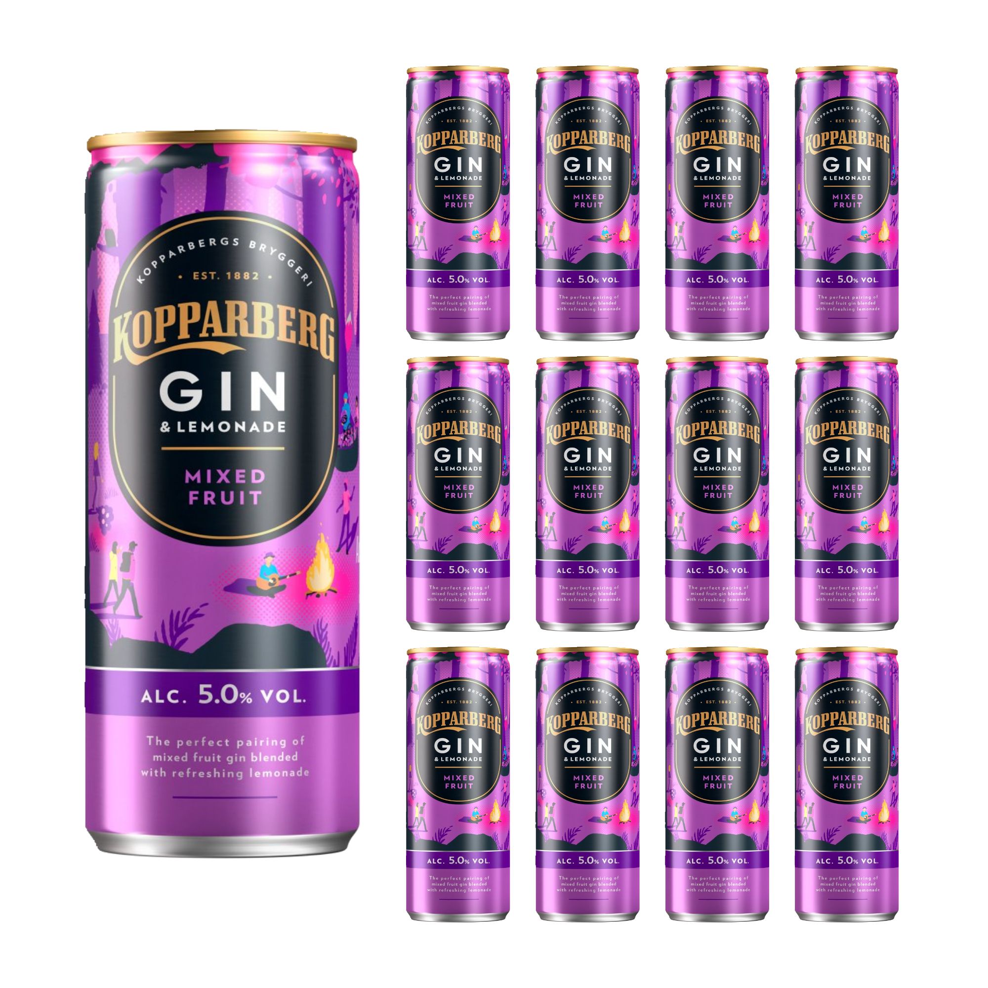 A refreshing pre-mixed drink combining Kopparberg’s signature Mixed Fruit Gin—infused with raspberry and blackcurrant flavours—with crisp, sparkling lemonade. This ready-to-drink beverage is perfect for enjoying chilled or over ice.