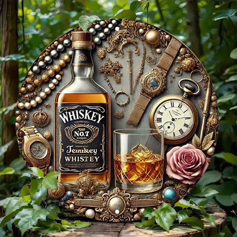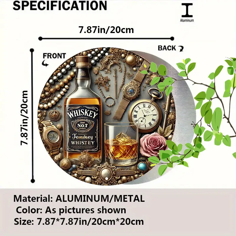 1pc Vintage-Inspired Whiskey Round Tin Sign – 19.81×19.81 cm, Rustic Aluminum Wall Art with Whiskey Bottle, Glass & Decorative Elements for Bar, Cafe, or Home Decor, Indoor Wall Decor|Vintage Wall Art|Intricate Detailing, Whiskey Decor